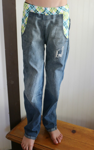 I used the Nowhere Man pants pattern in the size 10. I wasn't too pleased when I finished and it was very large on him like falling-to-the-ground-no-belt-can-help kinda large.